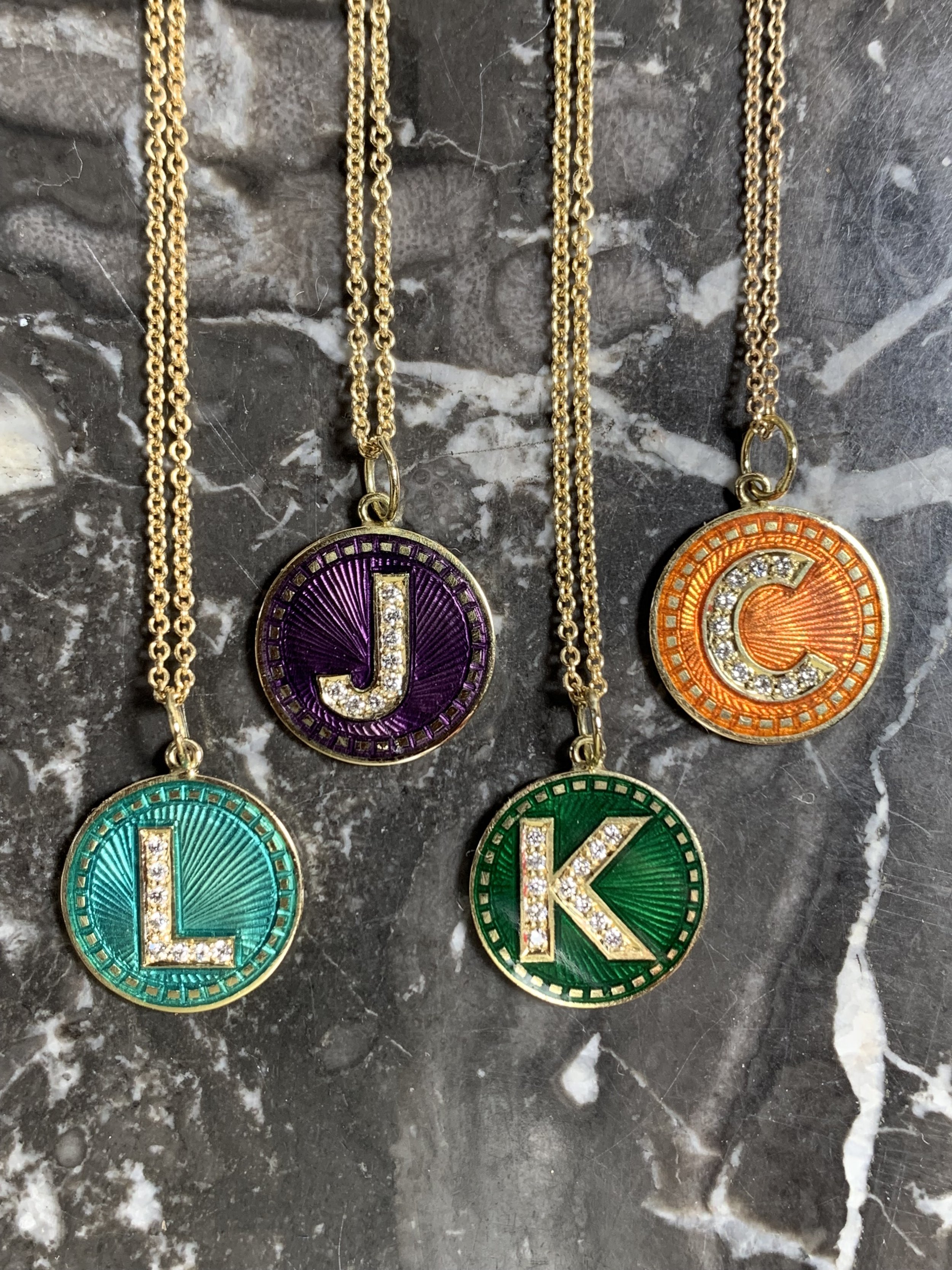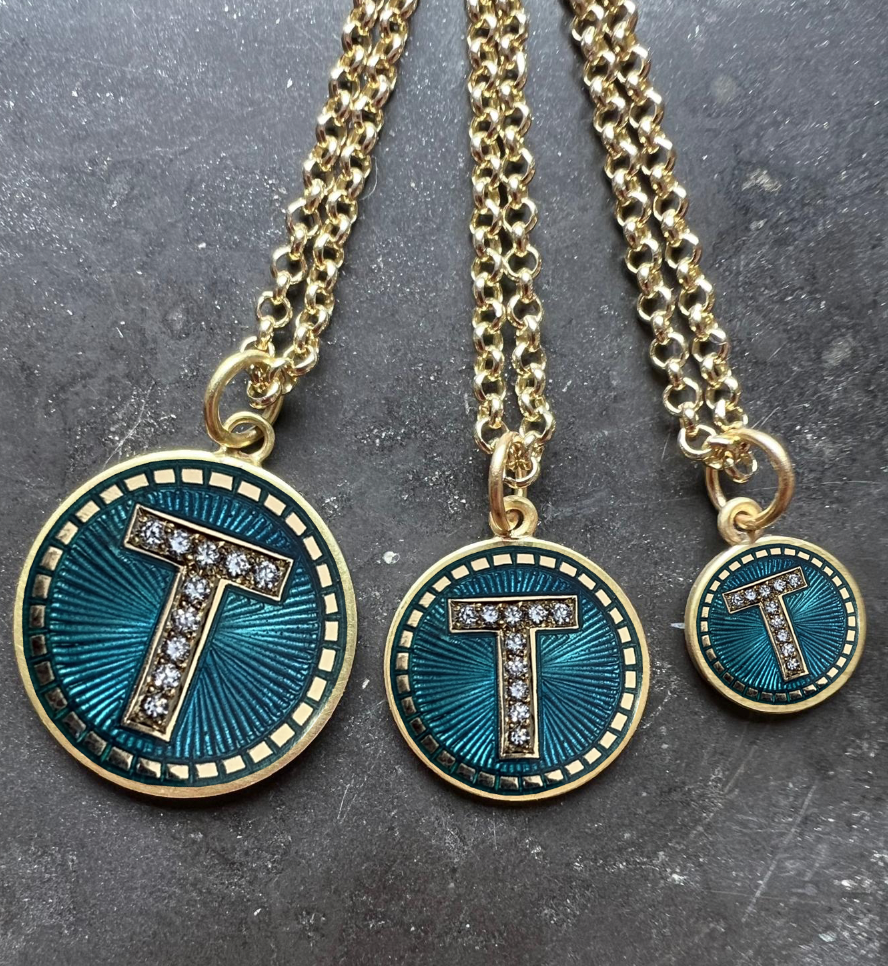 The Sun Ray collection are round 18ct yellow gold discs, which are cut and made into pendants by me in my workshop, and then they are hand engraved, hot enamelled and then set with diamonds in the initial, all by very talented skilled craftsman.